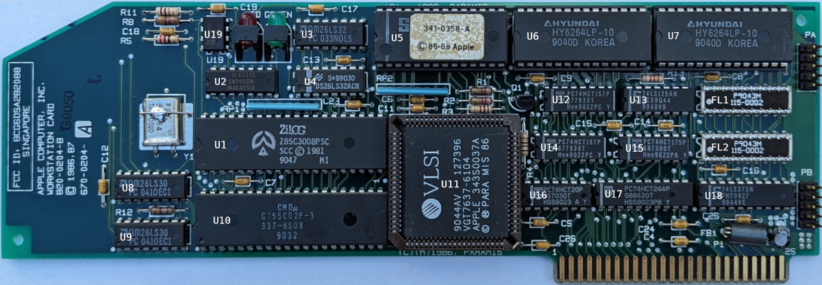 The card contains a dedicated 65C02 processor running at 2MHz with onboard SRAM and firmware. There’s a large custom ASIC that consolidates most of the glue logic for the local CPU subsystem and Apple bus connectivity. Without an in-depth analysis of the firmware it is difficult to say how the host CPU communicates with the on-card CPU. The custom ASIC probably implements some control registers internally, and may also provide direct access to the card’s SRAM.